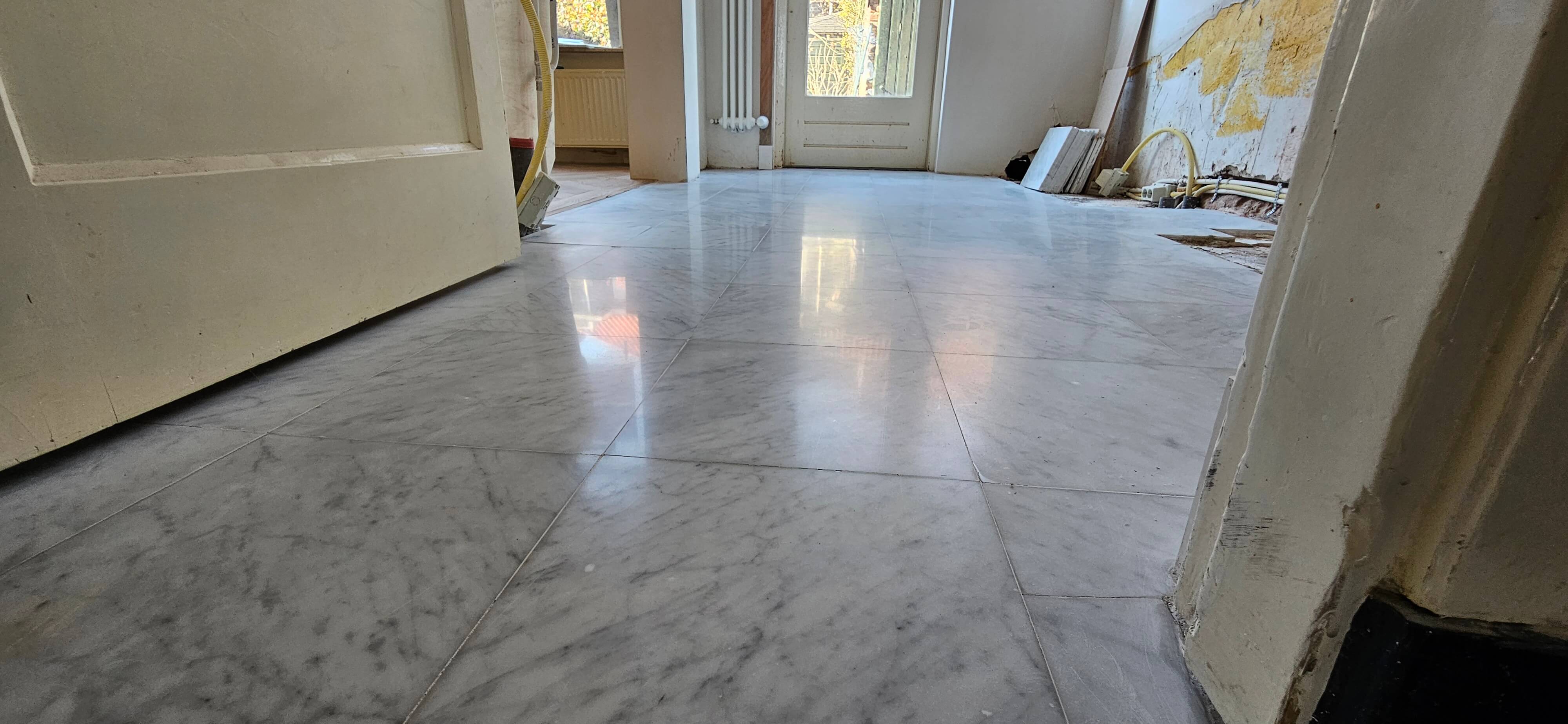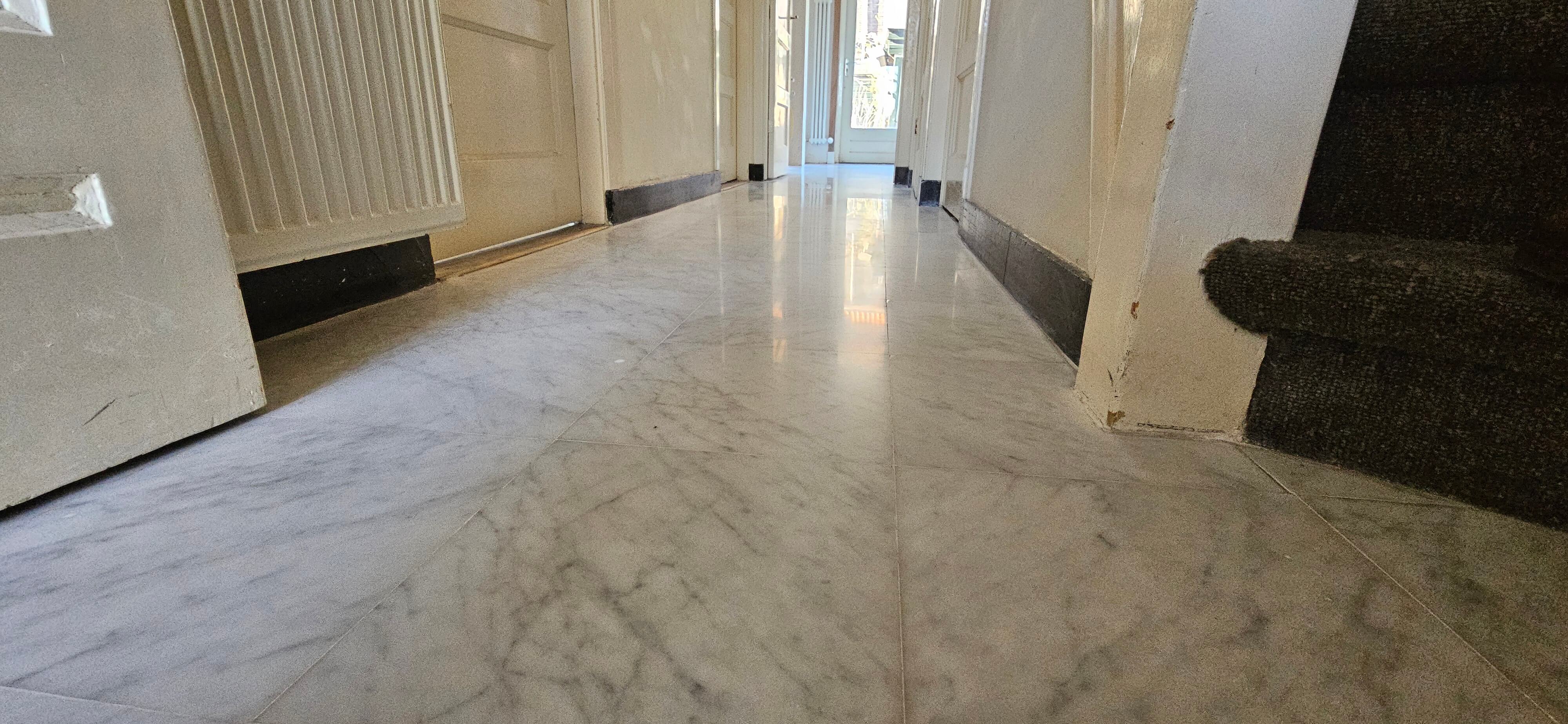 Tijdens de verbouwing van een woning in Voorburg zijn wij ingeschakeld voor de restauratie van een bestaande Bianco Carrara natuurstenen vloer. Een deel van de oorspronkelijke vloer ontbrak en moest worden aangeheeld met nieuw natuursteen.